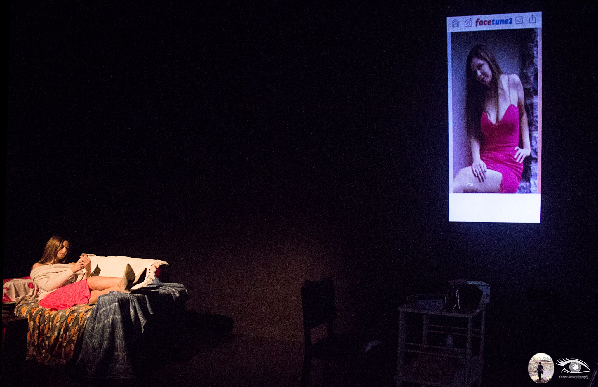 I felt a multimedia theatre production was the best medium to explore these issues, by merging live performance and film both real Mia and online Mia could share the same space. The audience could witness the hidden turmoil in Mia’s life alongside the creation of her vlogs, the content creation process and see an influencer use Facetune in real time.